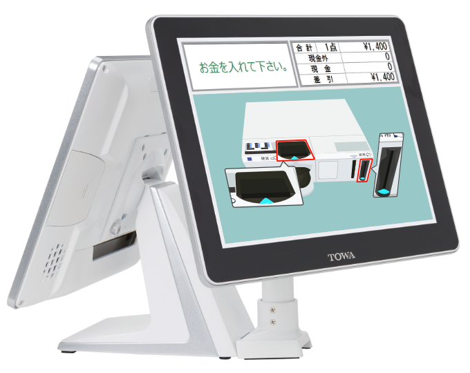 高機能・拡張性の高いPOSレジスターに自動釣銭機と客面ディスプレイでセミセルフレジを構成できます。